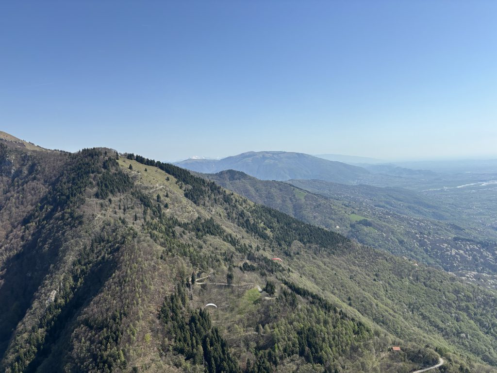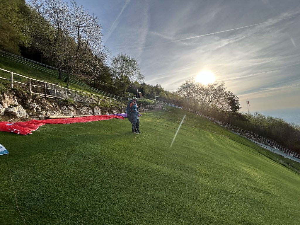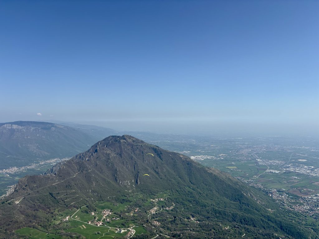 Wir haben keine konkreten Flugplanungen gemacht, aber es geht stetig nach oben und die meisten von uns fliegen gemeinsam richtung Panettone. Dort teilen wir uns ungeplant auf. Während zwei von unserer Gruppe die Piave-Querung Richtung Osten versuchen und trotz niedriger Basis schaffen, fliegen wir Richtung Westen – den ersten Abschnitt des Bassano Classico. Der Tag wird immer besser und die Brenta-Querung, der Startplatz Rubbio und Lusiana fliegen vorbei. Die niedrige Basis ermuntert uns jede Thermik mitzunehmen – und da wir keinen festen Plan haben, nehmen wir uns die Zeit und drehen brav jeden Bart aus. Nach der Schio-Querung, die viel einfacher verlief als gedacht, drehen wir ordentlich auf und arbeiten uns bis zum Wendepunkt im Westen voran. Der Rückflug verläuft entspannt mit dem prognostizierten Rückenwind und wir können noch ein bisschen ins Flachland fliegen um das Bassano Classico würdig abzuschließen. Wir landen alle in kurzer Abfolge, das Team aus dem Osten hat sogar den Piave-Talsprung trotz Gegenwind zurück geschafft. Nach dem obligatorischen Aperol gehts direkt zum Pizza Essen und die Wochenendverstärkung trifft nach und nach ein.